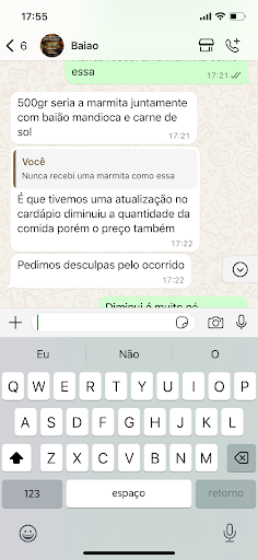 Sempre comprei comida nesse restaurante, porém hoje tive uma grande decepção. Fiz uma compra de duas marmita de baião de 2 para viajem, achei bem leve a embalagem, mas tudo bem. Quando cheguei em casa me surpreendi com a mera quantidade de comida, uma marmita sempre veio muito bem servida, tive uma enorme decepção. Uma comida cara e com uma quantidade que não daria nem pra uma pessoa. Entrei em contato com o restaurante, a mesma que me atendeu informou que o restaurante teve uma atualização na quantidade de comida e tiveram que diminui, coisa que não fui informada quando estava realizado a compra, pelo contrário, fui informada que a marmita era bem servida. Enfim, pouco caso do cliente. Me senti uma palhaça diante...
