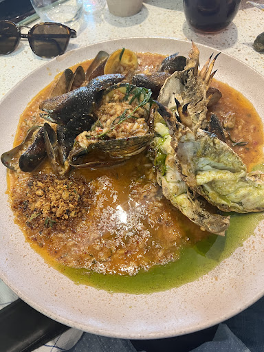 O prato parecia uma arte abstrata ao averso com a comida totalmente jogada de qualquer jeito em uma poça de óleo pelo prato e com o “Risotto” espalhado por dentro das conchas, da cavaquinha e ao longo do prato, conseguindo dificultar a simples habilidade de catar a comida, juntar no garfo e comer decorrente da necessidade de catar o arroz e proteínas espalhadas na confusão criada pela cozinha. Um prato sem sabor, com exceção do óleo, sem qualquer tipo de apresentação ou cuidado por parte da cozinha, um prato muito aquém do esperado e com uma nota digna da mais simples e pura decepção.
