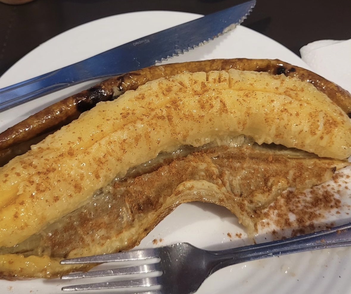 A sobremesa de banana com leite condensado e canela e cortesia da casa e extremamente saborosa.