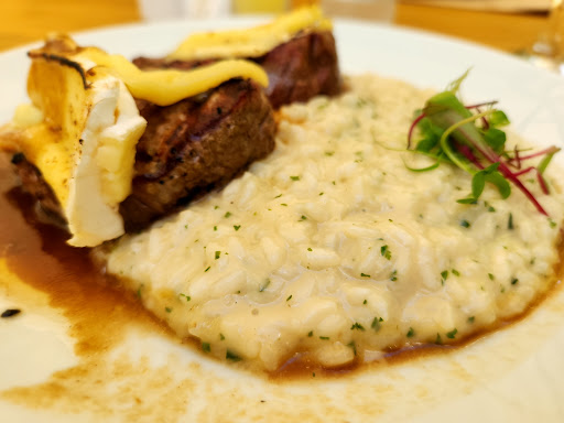 Sobre a comida: o bife ancho veio no ponto certo, super macio e saboroso. Pedimos o risoto de cebola caramelizada, que estava bom, mas ficou ainda melhor depois de um toque de sal e um pouco de queijo por cima rsrs. A grande surpresa da noite foi o risoto de abóbora com linguiça — nunca tínhamos provado essa combinação e realmente nos surpreendeu.