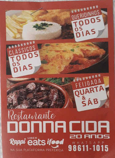 Quero aqui deixar os meus parabéns! Hoje quando eu procurava na internet por um restaurante nas proximidades, achei esse da Donna Cida, imediatamente liguei, depois fiz o meu pedido via whatsapp. Fui muito bem atendida. E quando meu pedido chegou, fiquei mais feliz ainda, meu pedido chegou bem embaladinho, com todo cuidado para não derramar na viajem, tudo bem separadinho. Comida gostosa com saborsinho caseiro. Agora já sei sempre onde pedir. Parabéns por todo trabalho e...