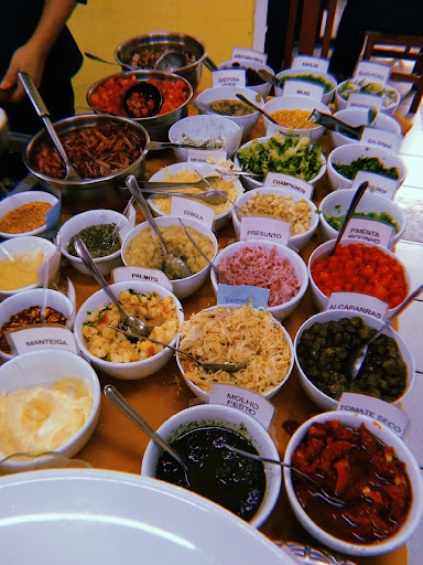 Tem um área onde um churrasqueiro prepara e fatias na hora opções como picanha, filé mignon, contra filé, frango, linguiça... a outra área onde pode montar seu prato de massas , escolhendo o tipo, molhos, recheios e ingredientes da sua preferência, tudo feita na hora na sua frente.