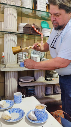 Para encerrar nossa experiência gastronômica pedimos o café grego preparado e servido no Brik e meus amigos, que café delicioso, eu como apreciador de café a tempos não tomava um tão gostoso como esse, ele vem acompanhado de um Kurabiê que é um biscoitinho de amêndoas fantástico, gostei tanto que comprei a caixa para levar pra casa.
