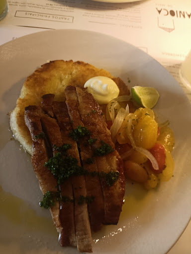 Um lugar para comer comida brasileira bem executada. Vi vários comentários negativos sobre o atendimento acredito ser devido a recém inauguração do espaço, é comum em early open necessidade de ajustes. A minha experiência hoje foi muito positiva a equipe do restaurante foi muito cordial e educada desde da entrada, e condução das refeições no salão, sempre educados e prestativos as solicitações. Iniciei a experiência hoje com o drink sugestão autoral “Da mata” ele é ideal ao verão fresh, não tem sabor residual alcoólico na boca, o capim limão valoriza, acompanhado do pastelzinho de bobo de camarão vem 06 unidades, bom para dividi, vem bem apresentado e saboroso, um bobo super bem construído e com pedaços de camarão nada de massa triturada. De prato principal fui no já conhecido peixe na folha de bananeira adoro o equilíbrio de sabores e texturas desse prato, o papelote confere um peixe num ponto perfeito que desmancha na boca, nessa versão de hoje só senti um pouco mais de punch ácido no vinagrete de feijão, o purê estava divino e bem adocicado, como sobremesa fui no segredo do bolo, um bolo de chocolate bem chocolatudo que é super equilibrado em açúcar, um dos melhores que já comi. A experiência foi muito agradável sempre que gosto de revisitar os sabores brasileiros de forma simples e bem executado o manioca é uma ótima pedida. Entrada + drink + água + prato principal e sobremesa gira em torno...