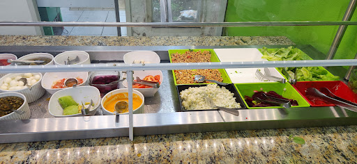 Conta com oferta de buffet de saladas e vegetais com bastante variedades, além muitas opções de grãos, castanhas e molhos variados.
