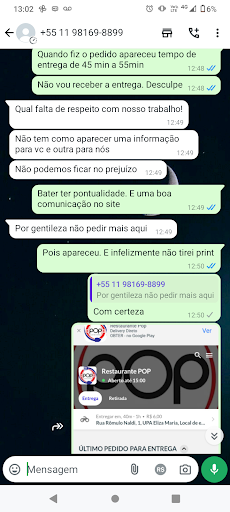A realidade, no entanto, é que o restaurante possui apenas uma maquininha, e, ocasionalmente, ela não está disponível, como foi o caso de hoje, pois um entregador havia saído com o equipamento. Nessa situação, o restaurante informou, de maneira desonesta, que não aceita mais o cartão, quando o verdadeiro problema era a indisponibilidade da maquininha.