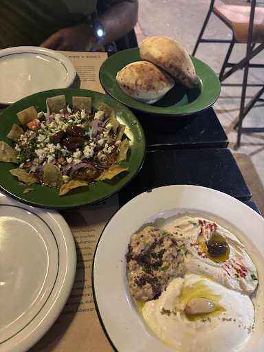 O hommus (pasta de grão de bico) é aveludado e equilibrado entre o tahine e o grão-de-bico, o labneh (coalhada seca) é suave e cremoso, com uma acidez refrescante, e o babaganoush entrega um defumado intenso, graças à berinjela assada, complementado por um leve toque de alho.