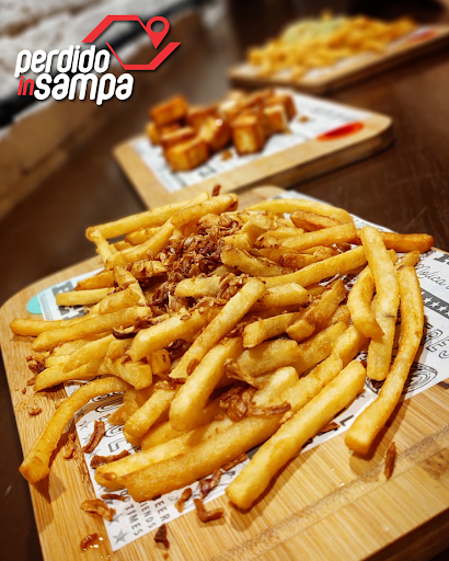 Faz parte das entradas, mas pedi junto com os sanduíches, a batata frita da casa (R$30,00). Vem com crispy de cebola e mollica di pane, que é uma farofa de pão temperada, que a tornam ainda mais saborosa.