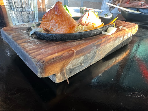 E para finalizar pedi repetição do salmão na chapa o da foto!! A chapa veio FRIO, Salmão morno e cru por dentro com uma textura duvidosa e para completar a tábua do suporte da chapa completamente suja e MOFADA!!!...