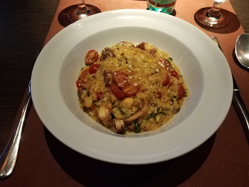 We didn't move.. I just switched places with my wife and took one for the team but in any case, the menu was a little bit dirty like something spilled throughout the pages but nothing major. I got an Octopus Risotto that was Ok. From my taste, they could've used a few more spices and pepper on it. It's not something exceptional but worth trying once. By the way, the plate I got was tipped on the corner of it, so something easy to change. My wife on the other hand got an amazing filet mignon that boy.. they showed what they are there for.