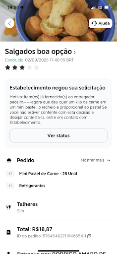 Read moreÉ assim que eles tratam seus clientes! Pedi pela plataforma do 99food mini pastéis e recebi o produto com pouco e alguns completamente sem recheio, após abrir a solicitação me responderam assim. Não pedi 1kg de recheio, mas sim o proporcional, coisa vocês desconhecem o significado. Eu ia deixar pra lá, mas depois que li o que me falaram decidi abrir reclamação em todas as plataformas possíveis do consumidor. Se vocês não conseguem padronizar o que vendem é melhor fechar esse quiosque! Não é pelo valor, que é irrelevante, mas como fui desrespeitada com esse deboche. Trabalhar com alimento é algo importante e delicado, se não levam a sério fechem, muito melhor do que prejudicar pessoas com expectativas quebradas, deboche e desrespeito....