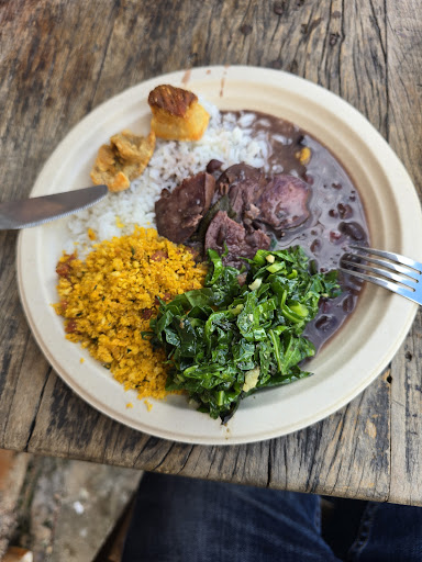 Fomos num domingo. Acho que essa ideia de servir feijoada foge da proposta do local. Fomos querendo comer os pratos da casa, mas só tinha a feijoada. Infelizmente, não sabíamos dessa variação de acordo com o dia. Como já estávamos lá, decidimos experimentar. O ambiente é gostoso, o drink pedido estava muito bom, mas a feijoada deixou a desejar. Não é ruim, dá para ver que tem bons ingredientes, mas o caldo do feijão é mais ralo do que o normal em boa medida e o arroz não estava grandes coisas. Salva a farofa, a couve e o torresmo, todos ótimos. Há uma opção vegetariana também, gostosinha, mas nada demais. Um bom ponto de comparação para a gestão do Sobrado seria provar a vegetariana do ser-a-fim. Não que precise ser igual... mas acho que seria um bom ponto de balizamento para adaptar a versão deles. No geral, ficou uma triste sensação de ter comido uma feijoada abaixo da média e com preço bastante acima da média em comparação a PFs. Porém, dá vontade de voltar para provar os pratos do restaurante e aproveitar mais o ambiente que é gostoso. O serviço em si, achei um pouquinho confuso, não entendi exatamente se era pra pedir para a pessoa do salão ou se era pra pedir no balcão as bebidas. Fora isso, foram...