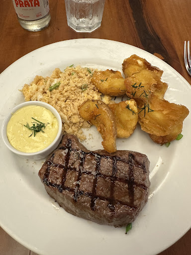 A comida foi uma grande decepção. Pedi um baby beef com farofa de ovo (R$96) e uma água com gás (R$10). Meu prato veio sujo de gordura e as batatas estavam encharcadas de óleo, apresentação PÉSSIMA. Por tais preços, eu não deveria nem ter que me preocupar com isso. Trocaram rapidamente as batatas e a segunda porção não veio muito melhor. O steak estava no ponto que pedi, bem temperado e suculento. A farofa de ovos não tinha sabor algum. E o molho béarnaise não me pareceu muito fresco.