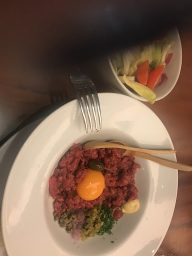 Cozinha Os pratos principais revelaram rigor técnico. O meu steak, malpassado, chegou no ponto exato, mantendo a suculência sem falhas na cocção. O steak au poivre da minha acompanhante apresentou centro rosado e molho de pimenta perfeitamente ajustado. A guarnição de batatas tourane, crocantes e douradas, confirmou a consistência da cozinha.