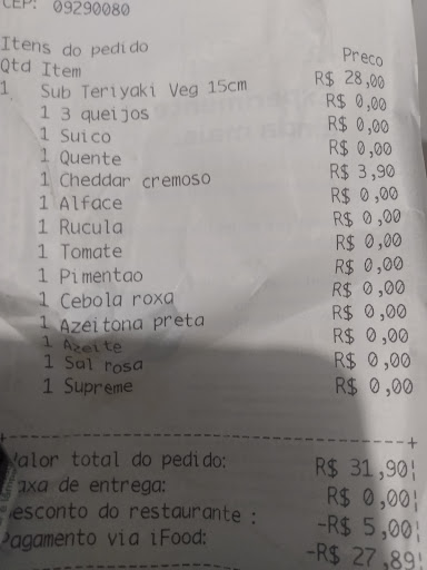 Nunca dei sorte quando compro nessa subway pelo ifood, já fiz várias compras e essa foi a minha última tentativa de compra... toda vez que escolho o sabor de frango defumado com cream cheesse ou carne defumada com cream cheesse o lanche vem praticamente sem recheio, é uma miséria tão grande que dá pra contar em uma mão os míseros pedaços de carne ou frango, recheio passou muito longe e os míseros vegetais... coloco a opção de rúcula 2x e sempre vem de 2 a 3 míseras folhinha de rúcula só.