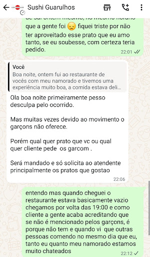 Read moreFui ao restaurante com minha namorada por uma propaganda que vimos e tivemos uma boa experiência, ambiente bonito, comida saborosa e atendimento simpático, o que nos deixou bastante frustrados foi um dos meus pratos preferidos da minha namorada é o sashimi na pedra de sal, como nenhum dos garçons mencionou, achamos que não era servido, comentei inclusive com minha namorada que senti falta, mas seguimos aproveitando a noite, no dia seguinte, vimos nos storys do próprio restaurante que várias pessoas estavam comendo justamente esse prato no mesmo dia que estivemos lá. Entrei em contato e a resposta que recebi foi essa que vocês estão vendo na imagem de que “devido ao movimento, os garçons nem sempre oferecem” e que “qualquer cliente pode pedir”, achei péssima essa colocação, como se fosse obrigação do cliente adivinhar ou pedir algo que não é oferecido nem mencionado. E o mais curioso é que, quando chegamos por volta das 19h o restaurante estava praticamente vazio. Tinha eu, minha namorada e mais umas 2 ou 3 mesas ocupadas, ou seja, não havia “movimento” para justificar a falta de atenção. Se isso acontece com frequência, como eles mesmos disseram, talvez o problema esteja na forma como os pratos são divulgados ou nos procedimentos do atendimento, e não no cliente, a experiência tinha tudo para ser excelente, mas esse detalhe tirou a sensação de cuidado e acolhimento, só espero que repensem esse tipo de resposta, porque ela desvaloriza quem realmente vai com expectativa de viver uma...