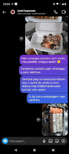 Read moreFiz um pedido no dia 21/02 pelo iFood e recebi uma comida de péssima qualidade. O salmão estava visivelmente estragado, mas o restaurante insistiu que havia sido aberto no mesmo dia (o que é impossível), pois qualquer pessoa perceberia que estava impróprio para consumo. Além do descaso com a saúde do cliente, o estabelecimento se recusou a reembolsar o pedido. O mais absurdo é que não há canais de contato acessíveis: o WhatsApp na bio do Instagram está vinculado a outra pessoa, e nenhum dos telefones fixos funciona. Fica claro que evitam dar suporte ao consumidor, possivelmente por conta das inúmeras reclamações. Isso não é apenas desrespeitoso, mas também ilegal. Servir alimentos estragados configura crime previsto na legislação. Portanto, fica o alerta: esse restaurante não se preocupa com a qualidade do que entrega, apenas em receber o pagamento. Evitem jogar...