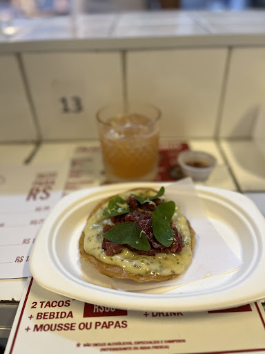 Read moreRestaurante bem mediano, que esperava ser ótimo pelo sucesso que vejo nas redes. Fui na quinta-feira que tinha cardápio especial pra arrecadar dinheiro para o Rio Grande do Sul. Pedi um Al Pastor e gostei da proposta com abacaxi, mas a carne realmente não tinha tempero. O fato deles servirem o taco com cebola e coentro não torna a carne saborosa. Também pedi uma tostada de steak tartare, que tinha uma proposta interessantíssima que gostei muito. Era MUITO boa, mas tava MUITO salgada, o que atrapalhou comer até o final. Pedimos batata Al Pastor para dividir e é boa, mas não surpreende. O fitzgerald que tomei estava excelente. Num geral, a comida não surpreende nada. Eles devem ser considerados bons pela falta de bons restaurantes mexicanos em SP. Bom, fui com mais 3 pessoas e, quando chegamos, nos direcionaram para o balcão - como la era bem apertado pra gente, apesar de amar ficar no balcão, pedimos 2x para pessoas diferentes para nos manter na fila da mesa. A fila andou e nunca fomos chamados. Em certo momento levantamos do balcão para fumar e avisamos ao bar e a mais dois garçons que já voltávamos - em nenhum momento disseram que isso seria um problema, inclusive, chegaram novos tacos que pedimos lá onde estávamos no balcão. Em 2 minutos um outro grupo de pessoas sentaram (com nossos tacos lá!) e ficamos sem mesa. Ninguém impediu ou pediu para que aguardassem na fila. Pedimos a conta, que pagamos de pé no meio do restaurante e fomos embora - sem nossos tacos. Não sei se foi pelo dia de movimento ou é sempre assim, mas o serviço foi péssimo. Só não me arrependo de ter ido porque a causa era nobre, mas...
