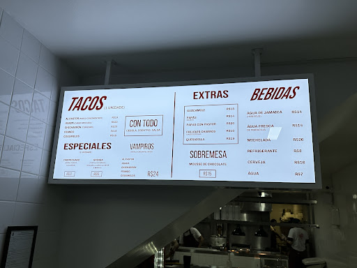 Perfeito, mas tem uma área que é tipo uma barra fora... se chove e está lotado (geralmente sempre está...,) vc tá amarrado porque não tem espaço coberto para estar na área externa... Tipo tem um guarda sol que mal abriga o espaço... E os molhos picantes não picam, eu amo picante e foi triste estar em um restaurante Mexicano e molho fraco, tinha um molho que era para ser defumado pelo sabor do gergelim mas nada... Os tacos são pequenos, bacana para experimentar varios tipos... Mas achei as carnes sem sabor, e pouco coentro... Meio mão de vaca. Normalmente cozinha Mexicana é caprichada e afetiva... Minha região natal é. A Michelada é fantástica só achei um tanto excesivo o molho inglês mas bom cada mestre com suas receitas... A caipirinha frozen de limão achei fracoooo de mais. Drink bacana foi o Paloma. As batatas sensacional, achei que a porção foi pouca coisa, mas é gostosa de mais um pico de Gallo para acompanhar achou que poderia ser uma dica boa para cortar esse tanto de gordura goshtosa... Retornarei mesmo fique a 1:30hs de onibus. Achou que cochinita pibil merece estar as vezes. E a carne de porco que usa achei muito magra e pouco suculenta... Eu vejo os trompos normalmente, suculentos e com todo esse tempero maravilhoso que dá vontade de morder, e aí não foi... A mousse de chocolate,deveria ser menos doce, se comer vai ter um pico glicêmico a ponto de morrer... Crocante é muito doce,marcante sabor da demerara,manteiga. Doce de leite que só é doce, mousse de chocolate que só é doce e sem sabor a chocolate... Triste... Comi todos os tacos o de Língua é o melhor... O de peixe achei fraco, falta acidez, coentro... Tem sabor de peixe de...
