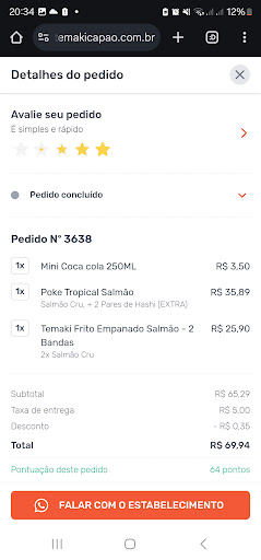 Read moreInfelizmente não vi os comentários aqui no Google e pelo Ifood, a nota é de 3,8 e resolvi dar uma chance (pois o preço estava razoável), mas me ARREPENDI amargamente. O prato deveria se chamar "poke de arroz com cebola". Praticamente não veio salmão, mas colocaram bastante cream cheese (que não foi informado na descrição do prato e se soubesse, não teria pedido), cebola com fartura, cenoura e pepino (as únicas coisas boas) e pedaços de abacate duro. Faltou manga e gergelim (que estava informado no cardápio). O pedido atrasou e quando enviei mensagem, eles não responderam. As únicas opções para lidar com isso era cancelando o pedido ou aguardar um novo prazo. DICA: Não confirme que o pedido chegou para conseguir o reembolso, pois não é possível se comunicar com o restaurante. Não merecem...