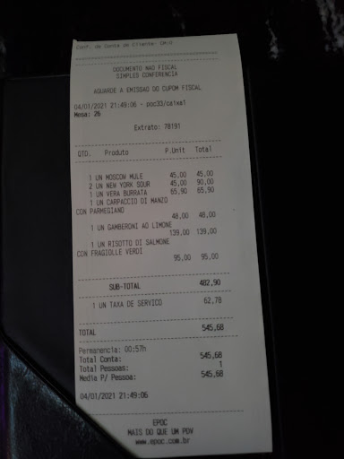 Perguntei pro garçom, pra iniciar, 4 opções de garrafa de vinho em média 375 reais a garrafa. Não tinha nenhum. Tudo bem. Pedi então um tempo pra analisar as outras opções, e pedi um Drink pra minha namorada de Aperol Spritz, ele já informou que não tinha também. Perguntei pra ele se tinha um drink com Gin, e ele disse que esse também não tinha.
