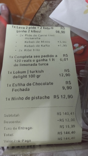 Read morePedido feito por aplicativo de entrega, chegou faltando 1 item (1 kebab de frango, foram pedidos 2 e só chegou 1). Reclamamos pelo chat do aplicativo e o restaurante teve a cara de pau de dizer que o pedido foi revisado e que estava errado, nos acusando de estarmos tentando enganá-los. Se recusaram a reembolsar ou enviar o kebab que faltou. DETALHE: já pedimos várias vezes e normalmente é nosso delivery favorito para esse tipo de comida. Resumo: por conta de 1 kebab de 19 reais perderam um cliente que pede quase toda semana. Além do atendente totalmente mal educado acusar-nos de estarmos fraudando o estabelecimento. Parabéns...