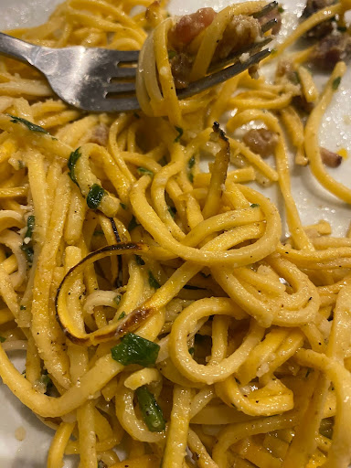 Começando pelo pedido, optei por um clássico carbonara com massa fettuccini. No entanto, fui surpreendido negativamente ao receber o prato, que continha três tipos diferentes de macarrão, todos grudados entre si. Esse equívoco comprometeu a qualidade da refeição, causando uma sensação desagradável ao paladar.