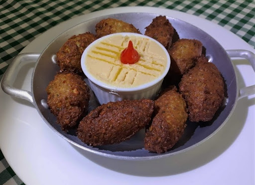 Em minha degustação eu iniciei com uma entrada muito saborosa. Falafel - que é um bolinho originário do Oriente médio, na maioria das vezes fritos, feitos com grão-de-bico ou fava, normalmente misturados com condimentos como alho, cebolinha, salsa, coentro e cominho. Muitas vezes, são consumidos em pão pita, com homus, tahine e salada.