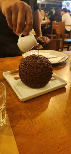 A finalização do fogo na esfera é realizada na mesa e é bem legal. Na calda o licor é bem presente. Já o pudim, a vontade é comer vários!