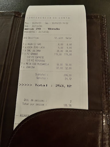 Read morePéssima no dia 30.09 unidade centro comercial Alphaville. Salada Juliana parecia salada de pacote de supermercado não tinha 1 pedaço de palmito na salada e por um valor de 38 reais. Pizza 1/2 peperone e 1/2 Caprese pedimos extra de mozzarella o que pode nos leva a entender que seria bem recheada. Haviam 4 fatias de mozzarella 1 em cada fatia. Não fizeram com extra e ainda cobram 18 reais o que seriam mais ou menos o equilvalente a 250 gramas se comprados no supermercado. A pizza Caprese sem comentários. Gastamos 256 reais por uma salada pronta de supermercado e uma pizza de 140 reais que estava um horror. Era cliente assídua agora quero passar longe. Inadmissível !!!! Levaram para mesa uma salada de pacote de supermercado faltando ingrediente e uma pizza que não vale nada . Para evitar constragemientos resolvemos entrar em contato hoje 01.10 por telefone com a gerente da loja tentando justificar o injustificável . O Atendimento dado pela gerente Paloma também inapropriado como sempre jogando a culpa na equipe de preparação e eu ainda indaguei que eram 19:30 e que haviam 2 meses e seria adequado verificar a qualidade do que se coloca na mesa e as respostas melhor não comentar aqui. A culpa não é da preparação com certeza a ordem e baixar a quantidade e qualidade e o preço nas alturas. Aliás Paloma o mal exemplo começa com vc que não deu solução nenhuma encima colocando a culpa no pessoal da preparação !!!!! Sem comentários Paloma porque vc é uma pessima gestora de pessoal e...