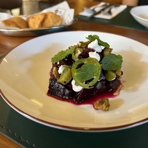 As beterrabas estavam perfeitamente macias e tostadas, com um sabor terroso intensificado pelo toque caramelizado do pistache, que também adicionava um crocante agradável, enquanto o iogurte e a hortelã traziam uma leveza refrescante, complementada pela picância suave do jalapeño e a sutileza do alho-poró.