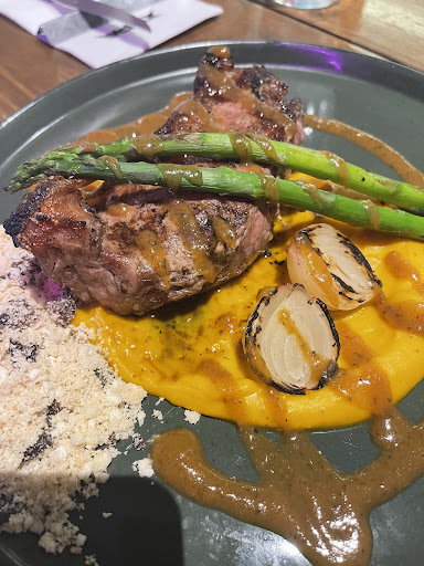Contra Todos: Bife de Chorizo na brasa, creme de abóbora cabotiá, pétalas de cebola rosa tostadas, aspargos grelhados na brasa e farofa $89 (Chorizo de qualidade, no ponto da casa perfeito)
