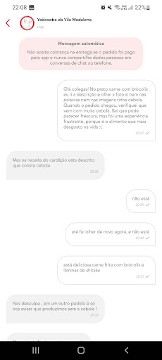 Fui falar de forma bem tranquila e educada pelo chat do ifood (imagens abaixo) para sugerir ajeitarem a descrição, e comecei a ser absolutamente desrespeitado pelo dono/gerente. Disse mais de uma vez que eu não sabia ler e que estava escrito na descrição do prato que vinha com cebola. Eu expliquei que NÃO estava na descrição, mas que deixaria registrada a minha reclamação, e a pessoa veio dizer que tinha meu endereço (?!). Enfim, achei tudo tão surreal que estou vindo aqui (e vou para todos os lugares de avaliação) para deixar registrado.