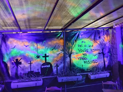Ambiente totalmente caricato, com bonecos de múmias, zombies, cavernas e peesonperso de filmes de terror, tem uma tela enorme passando os episódios do The Walking Dead, para você assistir enquanto aprecia seu lanche.