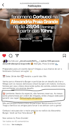 Read moreHoje, dia 28/04/2024, eu e mais 3 pessoas fomos à hamburgueria para conhecer a casa e ver o evento que teve com a presença do Corbucci. Desde o começo sabíamos que poderíamos participar do evento caso houvesse consumação, nao tendo NENHUM tipo de especificação do que podia ser consumido na postagem do instagram (como está mostrado no print). Ao chegarmos, avisaram que a consumação teria que ser obrigatoriamente o rodízio, sendo que, novamente, não haviam especificado nada previamente e iríamos consumir pratos a lá carte justamente pra conhecer a casa. Nós quatro e mais outras pessoas que não estavam conosco, ao questionarmos que isso não foi comunicado, o segurança que estava lá foi super gentil e solícito e disse que verificaria com a gerente e que poderíamos conversar com ela. Após isso a recepcionista Milena foi extremamente grossa, desrespeitosa e nada profissional dizendo que era norma, que o problema não era deles se não tava especificando e que se não fôssemos comer era só irmos embora que ela atenderia outras pessoas. A gerente de cabelo preto chegou pra intervir e teve a mesma atitude, disse a todos nós que o problema não era deles, que eles não iam fazer nada e que se quiséssemos, era só irmos embora, fechou a porta, deu as costas e saiu andando. Desculpa, mas não exigimos nada mais do que o nosso direito… não foi avisado que era obrigatório comer o rodízio e não qualquer outra coisa, a consumação ser obrigatória nos já sabíamos, mas o rodízio não, é nosso direito consumir qualquer outra coisa do cardápio (chegaram a falar que não trabalhavam com a pratos a carte, o que era mentira). Foi um descaso a forma com que fomos tratados, foi um total despreparo da recepcionista Milena e da gerente, elas nao souberam lidar com a situação, não souberam conversar com o cliente e resolver de forma amigável, não quiseram resolver o nosso problema, jogaram a culpa em nós que não tínhamos nada a ver. Depois de muita insistência o proprietário abriu excessão apenas para nós que estávamos presentes na frente do restaurante, porém ele instruiu as funcionárias a negar os itens a lá carte pra outras pessoas além de nós, o que é crime pelo Código de Defesa do Consumidor, e pelo que eu li pelas respostas de outras avaliações feitas por outros clientes, esse tipo de situação já ocorreu antes e o proprietário é conivente com a forma que os funcionários tratam os outros clientes… Após isso conseguimos entrar, mas foi uma situação...
