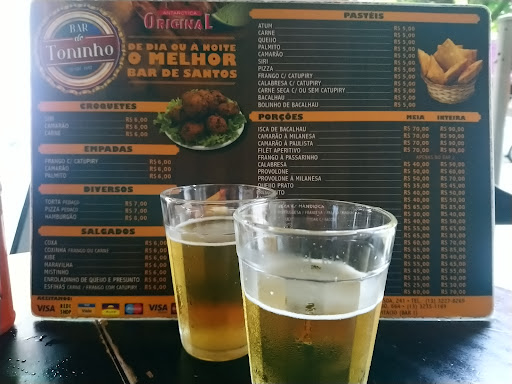 A minha experiência foi péssima, fui assistir ao jogo do Santos hoje dia 09/11 contra o Goiás no bar do Toninho como já fui inúmeras vezes e hoje tive uma péssima surpresa, sentei o garçom veio atender eu e meu amigo, trouxe o nosso pedido e quando fui ver as TVs, estavam todas preparadas para passar o jogo do Corinthians contra o Atlético MG, perguntei para o garçom se não ia passar o jogo do Santos e o mesmo disse que só iria passar numa tv na área de balcão interna do bar, aí eu fui até o local do bar e não tinha lugar para assistir ao jogo, mas fiquei muito indignado porque todos as TVs estavam passando o jogo do Corinthians e tinham um monte de mesas vazias e no lugar que estava passando em uma tv o jogo do Santos, não tinha mesa vaga e o lugar era pequeno. Achei um absurdo fazerem isso na cidade de Santos, onde uma boa parte e vai saber se não é a maioria dos clientes que vão lá se não são torcedores do Santos. Eu e meu amigo pedimos a conta e fomos embora imediatamente e fomos assistir ao jogo num barzinho estilo carioca próximo ao bar do Toninho e fomos muito bem recebidos, eles passaram o jogo do Santos até o final, sendo que o Botafogo estava jogando também e eles só mudaram depois que o jogo do Santos tinha acabado. Só digo uma coisa, uns dizem que o proprietário do Toninho é palmeirense, outros dizem que é corintiano, então hoje o melhor presente aos santistas aconteceu, o Santos passou o Corinthians na tabela e o Palmeiras perdeu ontem, então só posso dizer que como santista não só de time, mas como cidadão também, nunca mais coloco meus pés nesse bar e espero que todos os Santistas com S maiúsculo façam o mesmo, esse Toninho não tem respeito pela cidade onde ganha o...