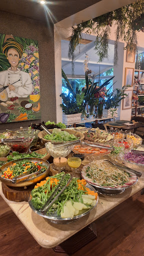A comida é sempre fresca e saborosa, com uma mesa de saladas absurdamente grande, caprichada e cheia de variedade. Dá gosto só de olhar e mais ainda de provar! O ambiente também merece destaque: lindo, bem cuidado, acolhedor e cheio de boas energias. É comum encontrar rostos conhecidos por lá, porque quem vai uma vez, com certeza volta.