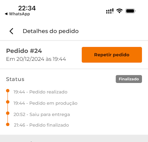 Como vocês podem ver pelo print, pedi a pizza 21:05 e estava com previsão de 21:50, quando foi 21:52 falou que tinha saído para entrega, moro ao lado então fiquei esperando, fui olhar as mensagens q vi que meu último pedido aconteceu o mesmo, comecei a pedir informações pelo WhatsApp e nada, 22:25 resolvi ligar e perguntar o que aconteceu com o entregador (já que da última vez a culpa foi da chuva) e qual não foi a surpresa quando sou informada que a pizza nem tinha saído, nenhum pedido de desculpas, disse que não tinha problema nenhum que era assim mesmo!!! Duas crianças esperando a pizza, era uma comemoração totalmente estragada pela falta de consideração! Eles não conseguem nem seguir o prazo q eles mesmo dão ou as informações que passam muito menos ligam para RELACIONAMENTO COM CLIENTE! Era uma cliente antiga que nunca mais volto a comprar e como moro na região faço questão de avisar aos conhecidos! Estou colocando o print...