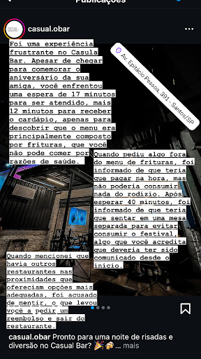 Read moreFoi uma experiência frustrante no Casula Bar. Apesar de chegar para comemorar o aniversário da sua amiga, você enfrentou uma espera de 17 minutos para ser atendido, mais 12 minutos para receber o cardápio, apenas para descobrir que o menu era principalmente composto por frituras, que você não pode comer por razões de saúde. Quando pediu algo fora do menu de frituras, foi informado de que teria que pagar na hora, mas não poderia consumir nada do rodízio. Após esperar 40 minutos, foi informado de que teria que sentar em uma mesa separada para evitar consumir o festival, algo que você acredita que deveria ter sido comunicado desde o início. Quando mencionou que havia outros restaurantes nas proximidades que ofereciam opções mais adequadas, foi acusado de mentir, o que levou você a pedir um reembolso e sair do...