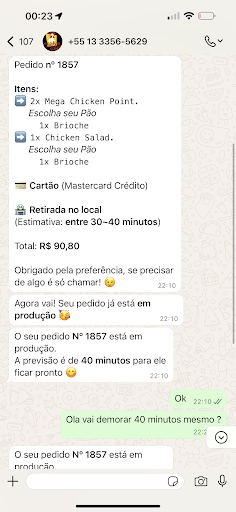 Read moreAcabo de ter uma péssima experiência com essa unidade. Primeira vez que faço o pedido, fiz pelo ifood. Ultrapassou o horário de entrega e ao tentar entrar em contato com o ifood, tive meu pedido cancelado. Tentei entrar em contato com a empresa pelo Instagram, não foi possível, logo após achei o WhatsApp e fui direcionada pra um robô, que depois me direcionou para um atendente. Tive um péssimo atendimento pelo WhatsApp, além de não ter tido minha pergunta respondida, mesmo após ter perguntado duas vezes, sobre um novo horário de entrega. Quando o motoboy chegou, precisei pagar de novo e ao ver a embalagem, cheia de óleo. O frango? Sem sal, óleo em excesso. Infelizmente uma péssima e estressante experiência que conseguiu...