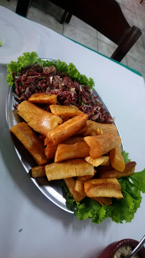 Sobre a comida Carne seca com mandioca frita: É em porção e enche bem, mas acho que 3 ou 4 comeriam tranquilamente e vem uma farofinha gostosa. A carne seca em si tava sensacional, uma delícia, um tempero maravilhoso e tava bem suculenta, agora a mandioca não ajudou muito rs tava seca e dura, não sei se porque não tava boa pra cozinhar (sabemos que as vezes mandioca fica dura) ou se foi porque fritaram demais, então só isso deixou a desejar, mas não é nada exorbitante também, não tira os pontos que eles ganharam cmg rs. Ahhh se não conseguir comer tudo, eles fazem uma marmitinha...