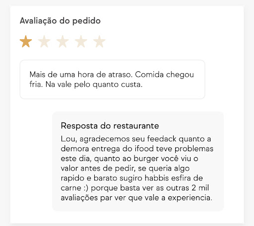 Edit: O comentário do dono já mostra o nível do restaurante. Eles demoraram mais de 1h para entregar meu pedido, mas se quisesse algo mais rápido, deveria ter pedido no Habibs. Um comerciante que não tem o menor respeito ou senso de responsabilidade com os seus clientes nem deveria estar aberto. Fiz uma reclamação justa e fui recebido com ataques pessoais no iFood. Em nenhum momento fiz qualquer de ataque ao restaurante ou ao funcionários, como pode ser visto abaixo. Moro na cidade, e vou fazer questão de sempre falar para todos sobre o ótimo serviço do...