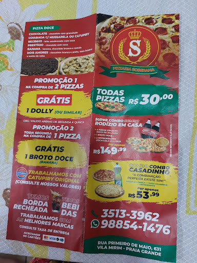 Read moreApesar dos funcionários serem educados, essa pizzaria falta muito pra ser uma pizzaria. A começar pela mentira na informação do catupiry onde no cardápio que fala q é original, ou seja, da marca catupiry so por Deus ... Negócio aguado e sem gosto de nada. Fora q pedi pra trocar a mussarela por um pouco de catupiry q meu filho em SP so come assim a cara do dono foi a pior de todas com o coitado do funcionário e pediu 15,00 a mais pra fazer a troca kkkk ( satisfação do cliente 0) nem pra negociar ou tentar ser simpático pra explicar o pq não consegue nos atender. Ate pq ninguém estava obrigando era uma sugestão ate pq quem trabalha no comércio entendo q fidelizar o cliente e o mínimo....Agora indo para o lado de uma pizzaria ta bem longe de ser nunca vi pizza Toscana om rodelas de linguiça kkkk toscana a linguiça e moida kkkkk enfim pizzaria ficou muito a desejar. Mais pra ajudá-los tenho uma pizzaria para indicar q pode ajuda-los muito a melhorar tudo chama-se que bella pizza fica em SP situada Zn. Minha nota pra voces e 4 a unica coisa q se salvou foi o atendimento dos...