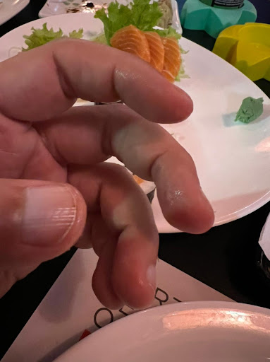 Vieram então os pratos quentes (era melhor que não tivessem vindo) o Teppan de Salmão; uma pedra de sal...deixamos de lado pq não dava pra comer. Guiosa com recheio encharcado em limão...horrível...parecia um copo de limonada..incomível ficou de lado também. Robata de carne, tal e qual o Teppan...níveis estratosféricos de sal... o desleixo seguiu-se nos pratos fritos: bolinhos, camarões crispy, tempurá, coxinha de kani e etc... todos encharcados em óleo e com sabor à queimado... características típicas de comida frita em óleo velho. Rolinho primavera estava mesmo queimado... (o excesso de óleo é tanto que se pode ver nas fotos).