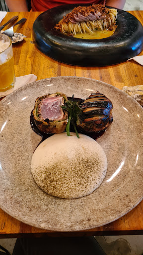 Eu - pedi um refresco de limão siciliano. Na entrada fui de tartar de atum. No principal, pedi a famosa caldeirada caiçara. O tartar foi algo surpreendente. Pedi mais pela curiosidade, que pelo desejo. Admito que não imaginava que o sabor dele seria tão diferenciado, mas fico feliz em estar errado: o sabor é muito marcante; existe um contexto que lembra muito o tartar convencional, mas ele tem uma alma totalmente própria e distinção própria. Tudo feito com muito capricho e beleza. Vale a pena conferir. A caldeirada é um show à parte. É mais que um belo prato de sabor forte - mas ao mesmo tempo equilibrado. É uma obra de arte. A composição do prato e seus acompanhamentos é bem diferenciada e realmente original. Saboroso ao extremo. A vontade é a de não parar de comer. No final, cumprimentei o chef e dei os parabéns pelo excelente espaço, refeição de primeira, e pessoal tão educado e dedicado em serviço. Fomos tratados de forma muito atenciosa e respeitosa do inicio ao fim.