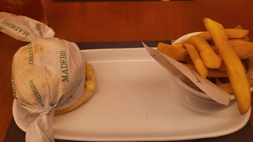 Hambúrguer (Madero) O hambúrguer estava muito bom. A carne vem rosada no centro — algo a ser avisado para quem prefere o ponto mais passado. À primeira vista, o tamanho pode parecer pequeno, mas surpreende: sacia sem deixar aquela sensação de peso. O conjunto é bem suculento, com maionese, queijo e molho em abundância, por isso é altamente recomendável comer dentro da embalagem de papel fornecida.