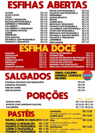 Read moreA menina que nos atendeu foi muito gentil, perguntamos a marca do requeijão, ela não sabia mas não se importou de ir verificar. Tinha algumas mesas, mas o pedido não demorou nem 20 minutos. Pedimos esfihas, de calabresa, frango, escarola, mussarela com bacon, brócolis e de chocolate branco com morango. Todas excelentes. Só acho o ambiente um pouco escuro, deveriam melhorar a iluminação interna. O preço é justo pelo que oferece, massa fina, recheio gostoso, requeijão de qualidade (Alto Alegre), refrigerante não tem preço exorbitante como em outros lugares que a lata chega a 9 reais. Ponto negativo é eles não repassarem a taxa de 10% para as garçonetes. Perguntamos para mais de uma e as mesmas disseram q elas não recebem, o que ao meu ver é totalmente errado. E sim, eu sei que os 10% paga quem quer, e por isso pagamos em dinheiro direto para quem...