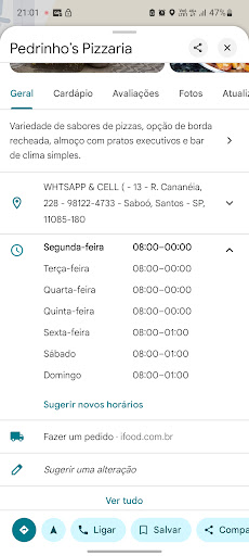 Olá gostaria de fazer uma reclamação, sempre pedi pizza aí. Sei que antes havia um dia que não abria, mas para ter certeza hoje entrei no Google e no site de vocês. Está falando que o restaurante está ABERTO. Fiz o pedido, aguardei, liguei e nada. Fui até a porta de vocês e está FECHADO. Acho que é justo vocês colocarem que segunda não abre e que esta fechado em todos os sites, assim o cliente não fica aguardando uma pizza que nunca vai chegar Acho uma falta de consideração com o cliente manter...