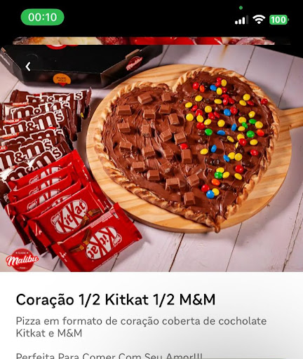 Pedi a pizza de coração meia kit Kat e meia M&M, na foto está a coisa mais linda, bem recheada, me chega uma pizza horrível, fria, nada do que eu estava esperando, decepção total com a pizzaria, estava super animada para a receber a pizza, fora que após a pizza chegar eu enviei uma mensagem para o local, dizendo que não gostei do que chegou, esperava mais.... Não deram nenhum suporte, resumindo atendimento péssimo, pizza ruim, HORRÍVEL, dura, fria e feia!
