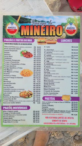 Vou relatar o que aconteceu com minha família hoje no Quiosque do Mineiro. Meu tio e minha tia estão hospedados no hotel que tem parceria com esse negócio, diante disso, eles tem o DIREITO de ter 1 guarda-sol (detalhe importante). Meu pai hospedou a gente num hotel muitoo longe desse lugar. Ontem fomos a pé pra nos encontrar com nossos tios e hoje também fizemos a mesma programação. A DIFERENÇA entre ontem e hoje é o seguinte: ontem o dono do quiosque não estava presente! Quem nos atendeu nesses dois dias foi o Marcelo, super gente boa aliás (atendimento nota 10, já explico o por quê). Meu pai pegou um guarda-sol tambem (éramos 7 pessoas) e fomos consumindo desde às 10:00 horas até as 13:00! Algumas famílias simplesmente pegavam guarda-sol e não consumiam NADA, aliás, ontem fomos a ÚLTIMA FAMÍLIA A SAIR! Obviamente a conta venho cara, mas isso não importa tanto no contexto. Estávamos com 2 contas (minha família e meus tios) e 2 guarda-sol. Tínhamos acabado de pedir uma porção e o Marcelo nos avisou que o dono simplesmente decidiu que iria tirar um guarda-sol da nossa família porque tinha duas pessoas na "fila", isso num sol de no mínimo 33° graus... Pedimos para o Marcelo ir falar com ele, pois estávamos consumindo em duas contas e tínhamos tal direito. O Marcelo voltou lá e discutiu com o dono sobre o assunto, tentou fazer ele mudar de ideia mas não obteve sucesso. Falamos pra fechar a conta se ele realmente queria aquilo porque era um desaforo! Não fizemos mal a ninguém e repito: estávamos consumindo. O dono não cedeu e mandou a conta para o Marcelo entregar, daí meu tio e meu pai pagaram a conta, enquanto isso minha mãe e minha tia foram no quiosque do lado perguntar se tinha guarda-sol sobrando e elas foram muitoo bem recebidas. A gente não tinha nem comido a porção direito ainda, mas como fomos EXPULSOS por fazer nada além de consumir, pegamos a porção / nossas coisas e fomos pro quiosque do ladinhooo do dono. O dono é muito egoísta, porque enquanto todos olhavam pra gente, percebemos que ele tinha MUITOS guarda-sol reservas, além de ser infantil ao ponto de ficar debochando da gente e nos encarando o tempo todo! E isso é um resumo, tá? Só não dou 0 estrelas porque a Google não permite!!!!!! NOTA 0 para o Alex, pode ser?